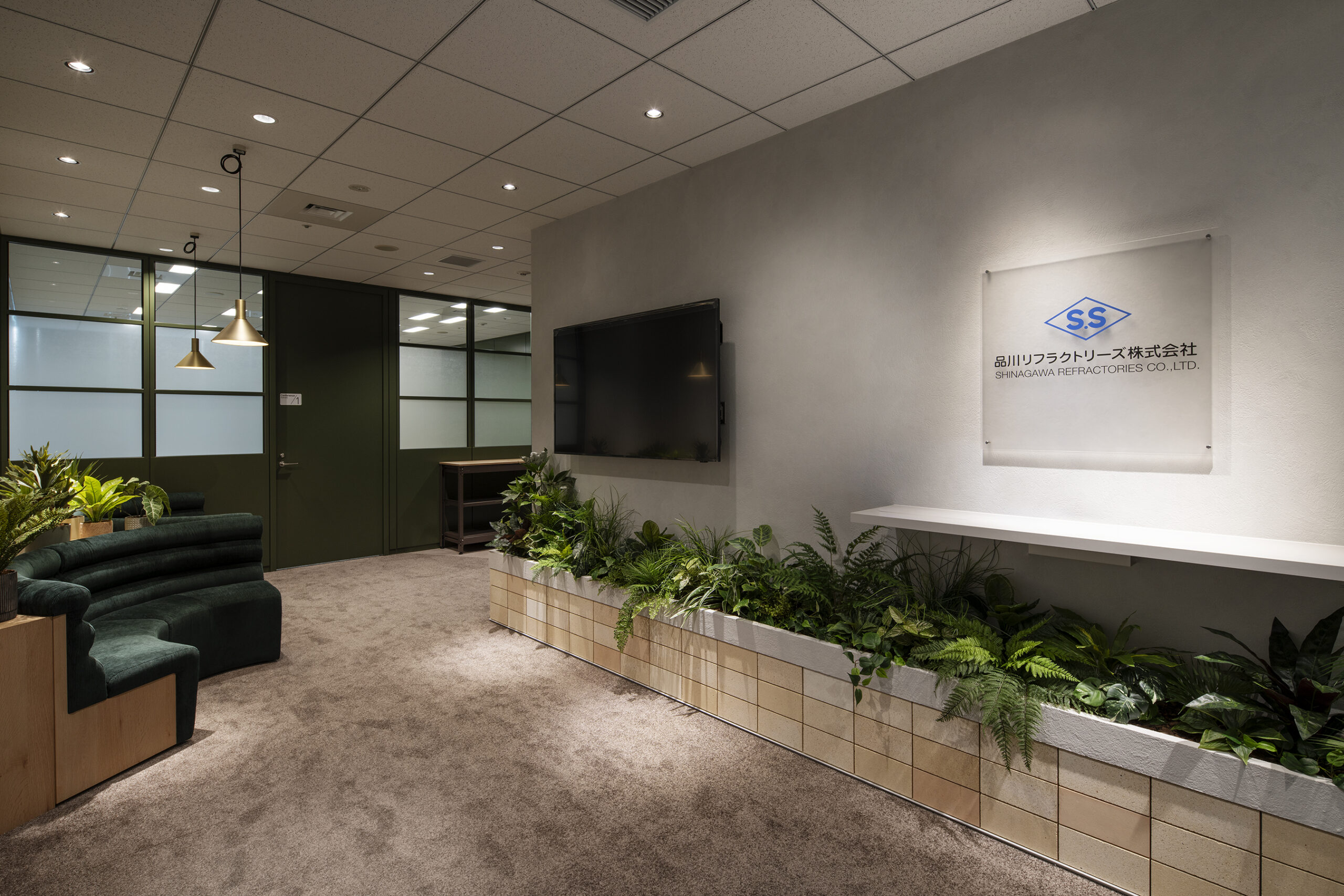 お客様の商材を内装材として取り入れ、柱には不燃木材、受付には耐火レンガを使用しました。
