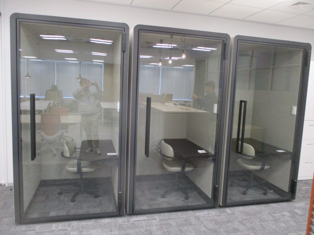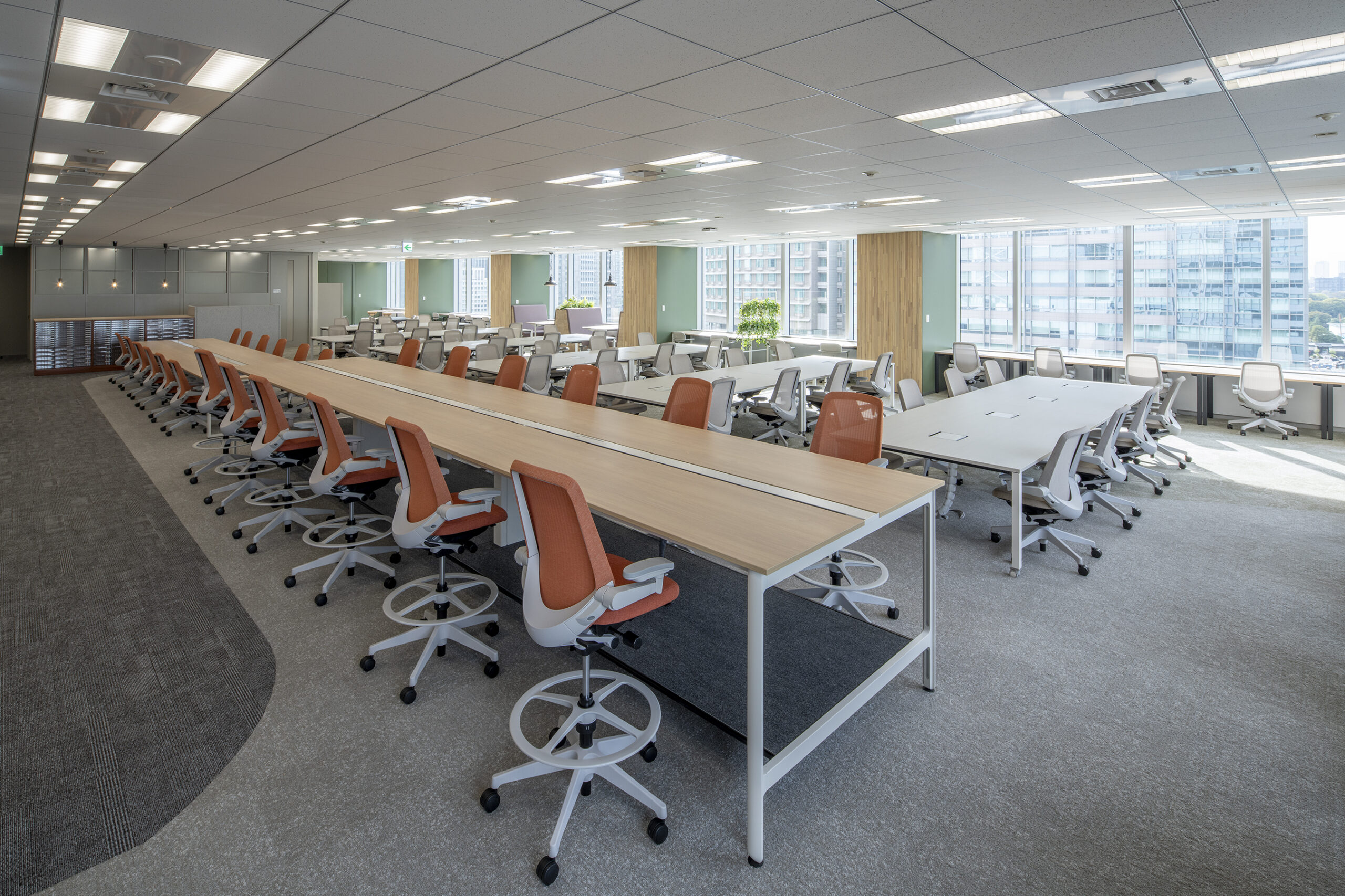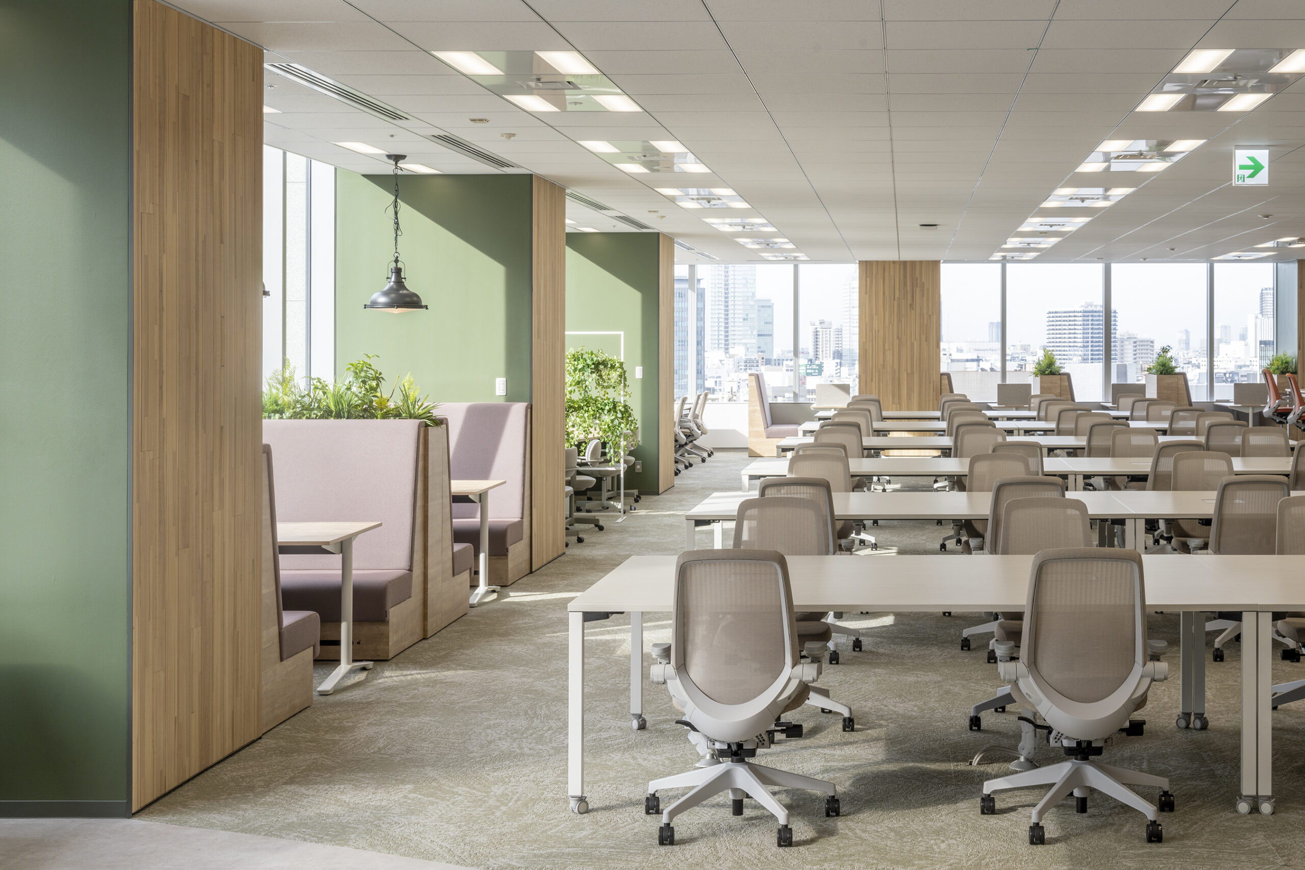 執務エリアは使い勝手がよくスペースの自由度を高めるフリーアドレスデスク、複数人で作業が出来るグループテーブル、ファミレスブースを取り入れました。
